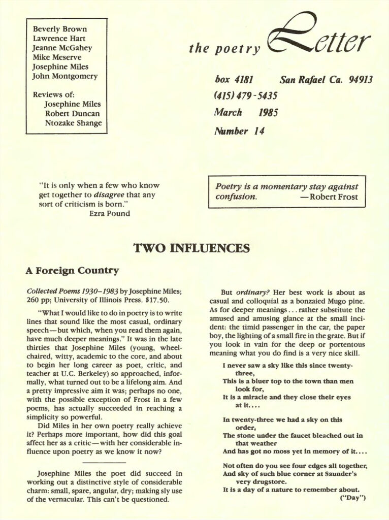 Then there was the poetry LETTER. McGahey served for years as screen reader for the Phelan and Jackson literary awards given by the San Francisco Foundation. In 1983, her contacts led to grant support for a newsletter of literary debate. Distributed free throughout Northern California, the poetry LETTER ran from 1983 to 1986 and did not disappoint in drawing controversy. It was at this point that the hitherto loose group crystallized as a non-profit organization, the Lawrence Hart Institute.